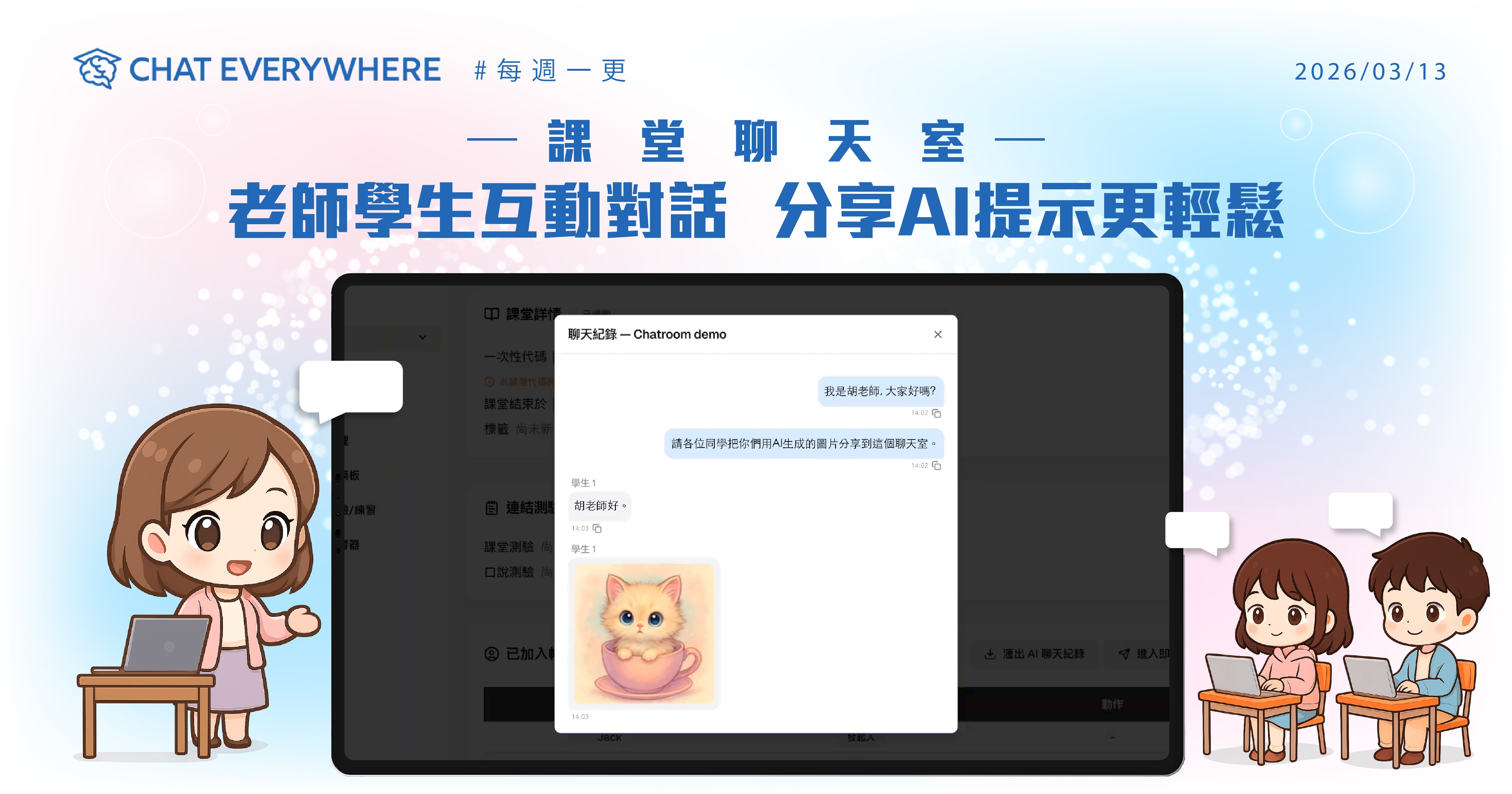課堂聊天室登場,方便課堂上的學生們線上討論,分組的功能也正在開發中。期請期待!