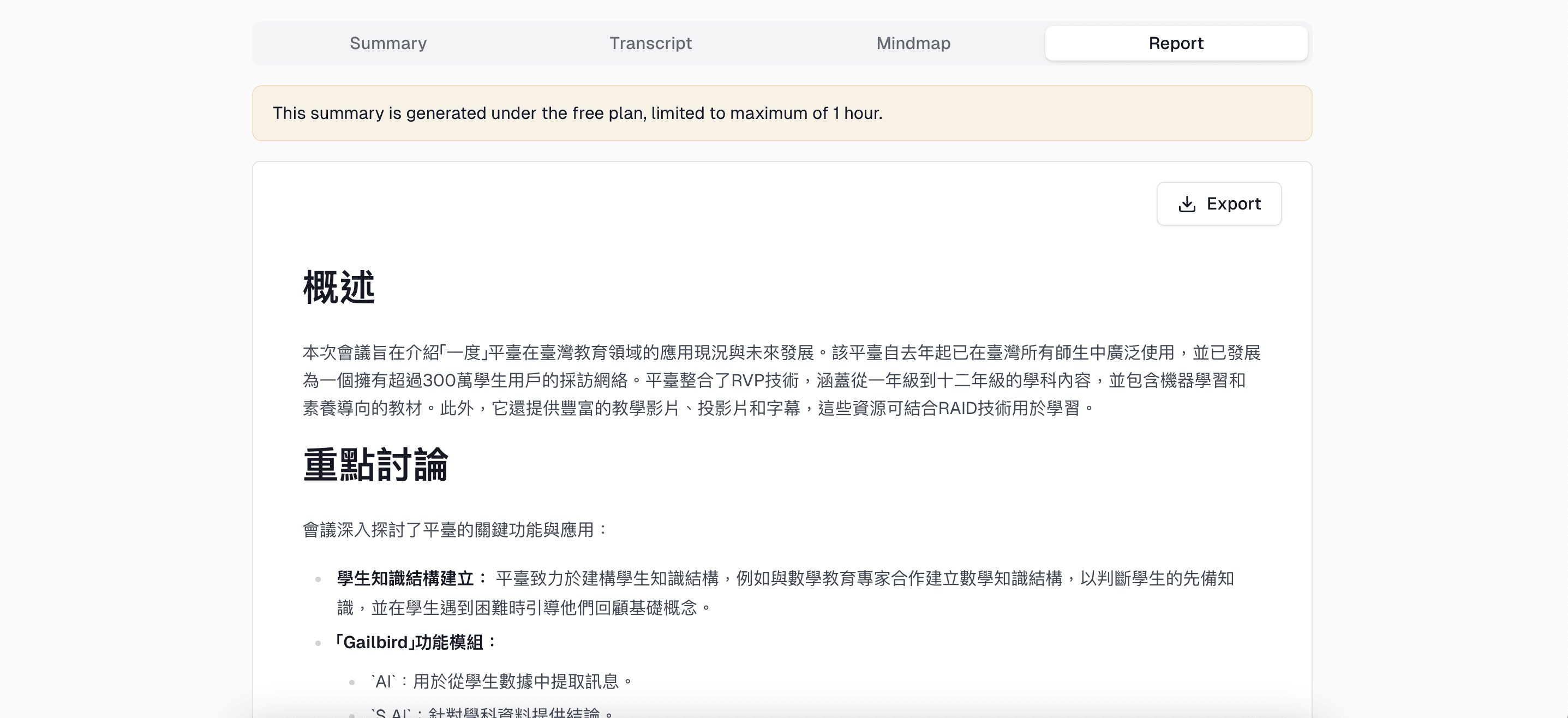 Upload audio and get reports, transcripts, shareable mind maps, translations, and YouTube chapters in seconds.