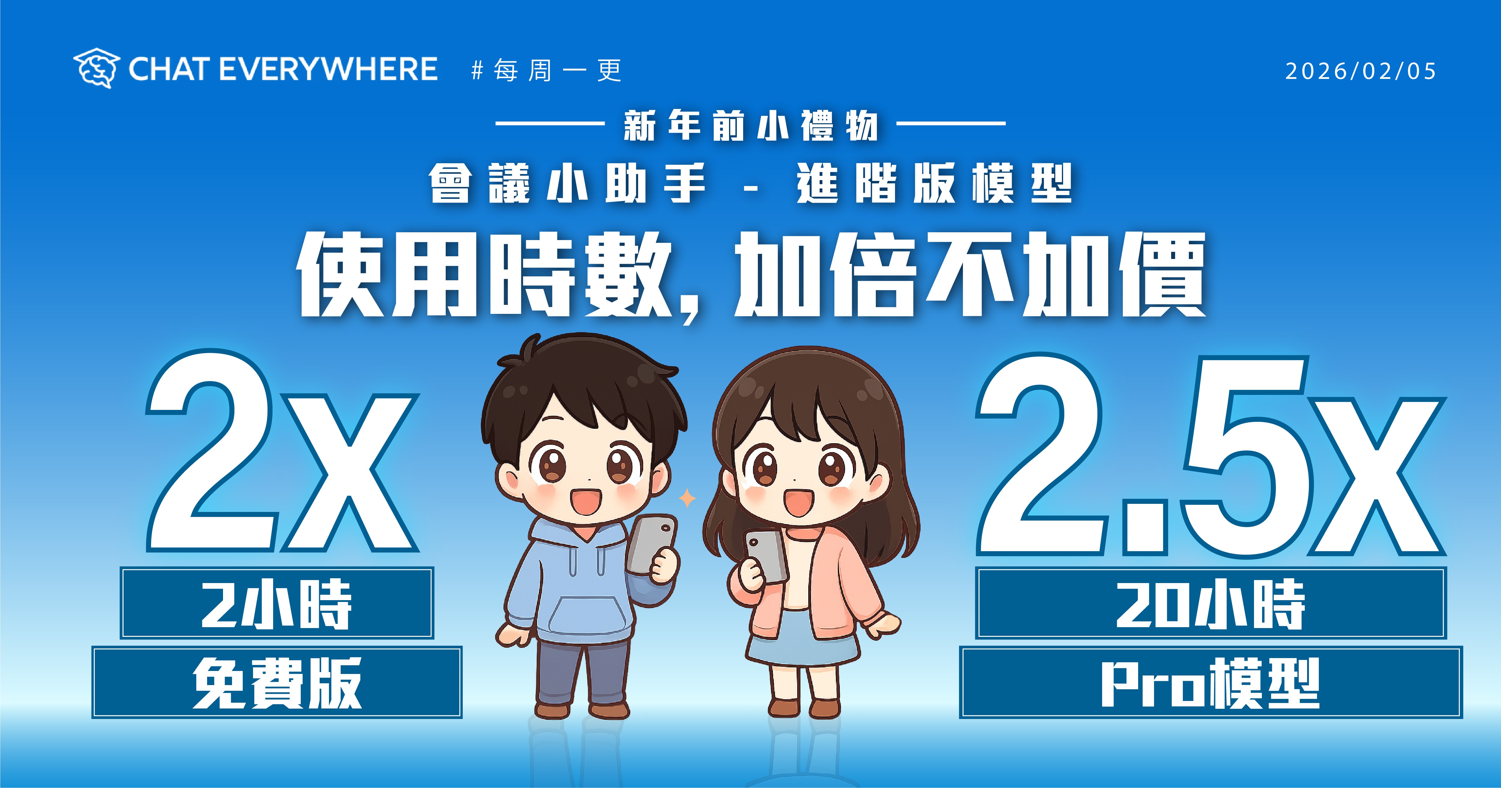 大家反饋會議小幫手的 Pro 模型很捧,但 8 小時真的不夠用。所以我們不止給大家升級了 Pro 模型,還加倍了額度到 20 個小時!